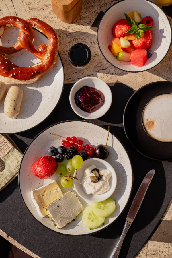 Südtiroler Spezialitätenbuffet mit kalten und warmen Vorspeisen, Suppen, Ossobuco (Kalbshaxe), Spinat- und Kasknödl, Marillenknödl und Strudeln sowie optional 3erlei Wein zur Selbstbedienung.